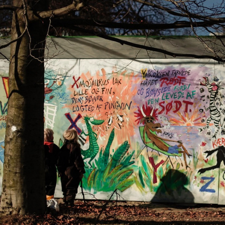 Alfabøvset (Alphaburps) is 28 crazy, burping, happy and quirky letter-rhymes for children. For each letter, the Felumb Conrad family wrote a wild and quirky rhyme about a burping animal. Interpreted by Jørgen Eivind Hansen in a 34-metre-long painting, all the diverse creatures from the rhymes came to life in Fælledparken in March 2013 — part of the art project surrounding the construction of the Copenhagen Metro. The book collects photos from the painting alongside the original rhymes.