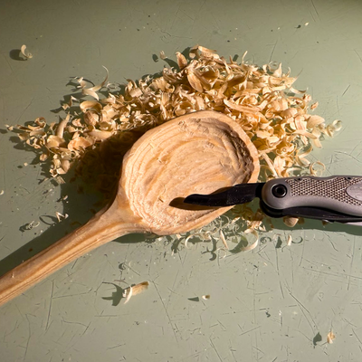 This is one of my latest joys — carving spoons. It is so restful, a great gift, and besides that, I really have a lot of fun forming the spoons, or as I call it, finding the spoon. The spoon reveals itself when I follow the grain of the wood, feel where the spoon is.